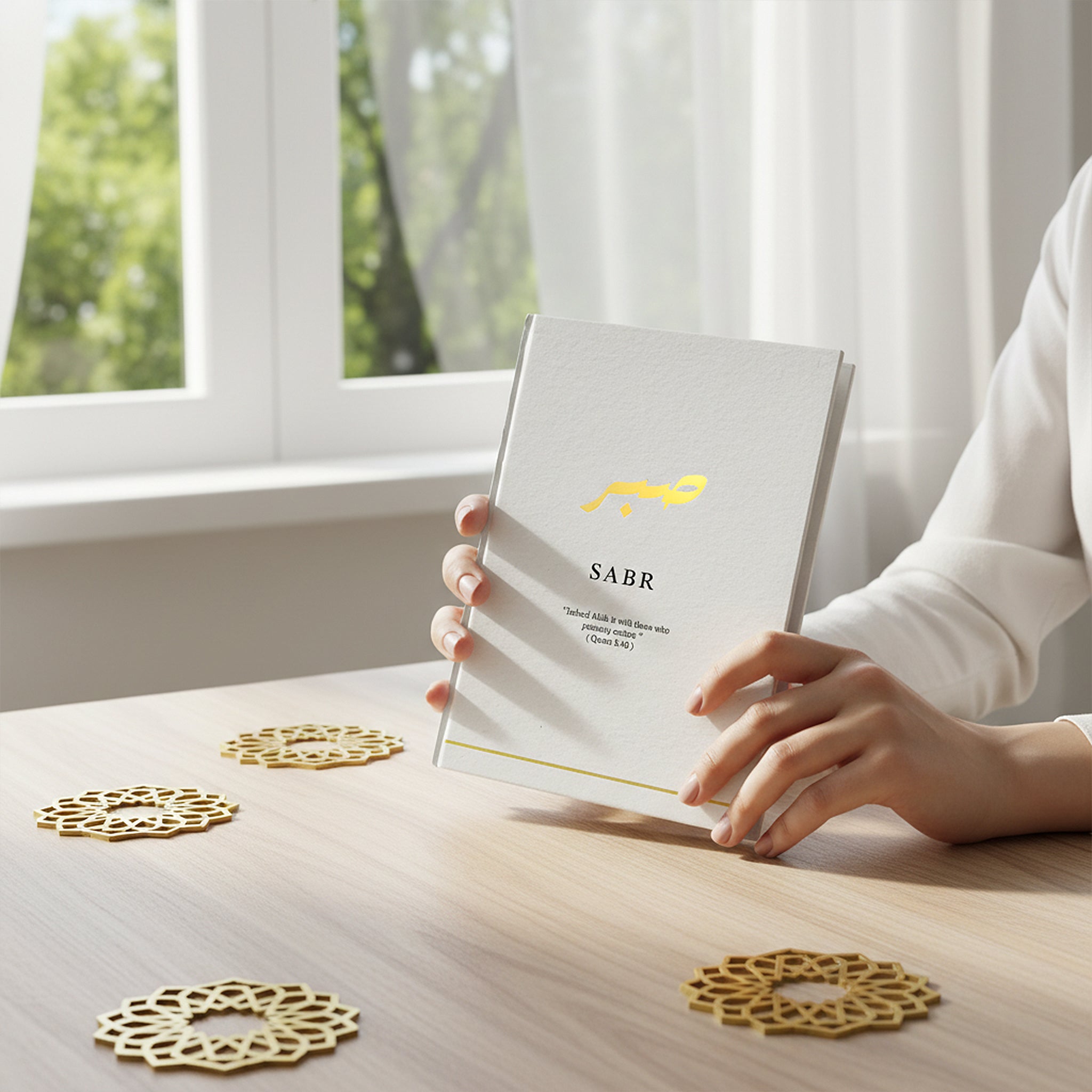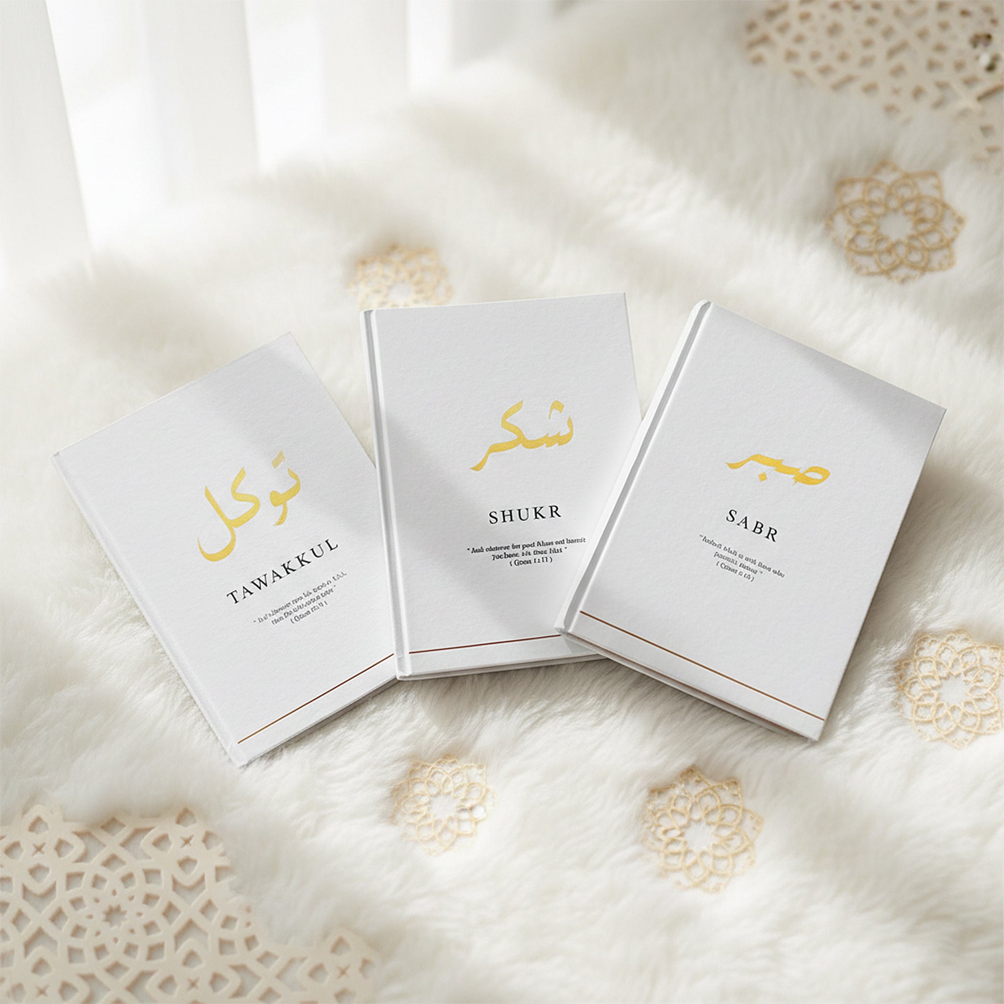 Each notebook set is crafted with the following Islamic phrases: "Sabr," " Shukr" and "Tawakkul " These words are sacred and serves as expressions of praise, gratitude, and acknowledgment of the greatness of Allah. Each phrase carries its own unique essence and spiritual value:
